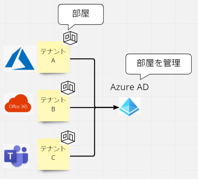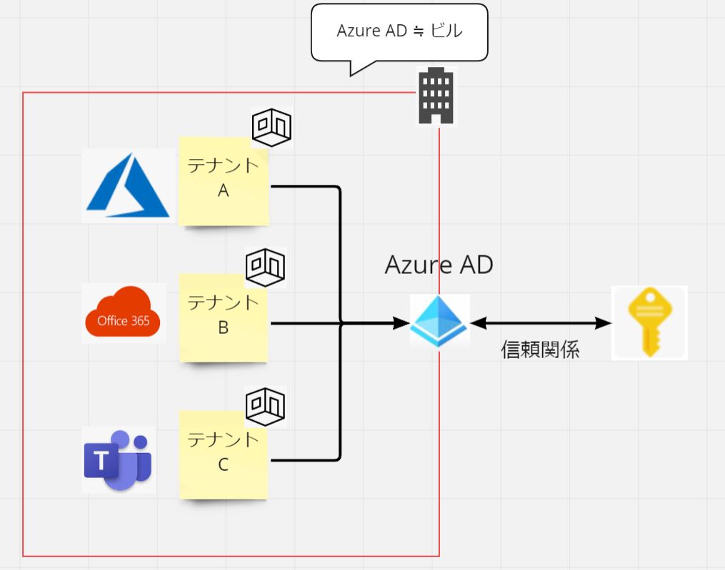 テナント(入居者)が入るためのビルに相当するのがAzure ADです。テナント(入居者)のユーザ情報、グループ情報、アプリ情報などを保持し、認証を行う機能を提供します。