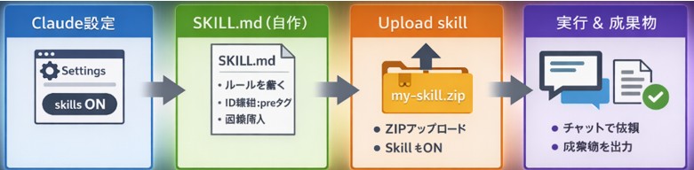 <目次> Claude Agent Skillsを最短で試す(PPT生成・超シンプル) 全体像 STEP1:SkillsをONにする STEP2:PPT生成Skillを作って実行す …