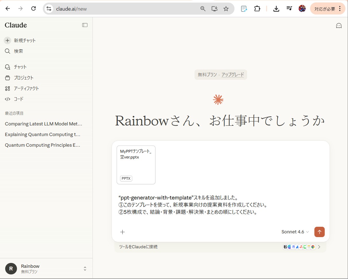1. 使用したい PowerPoint テンプレート(.pptx)をチャットにアップロードします。