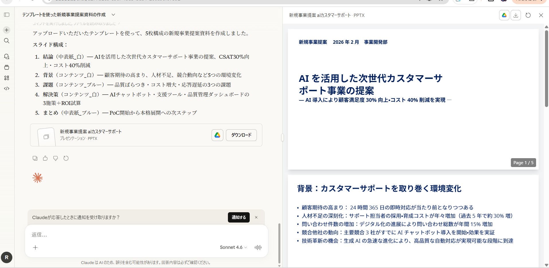 Claudeが、指定テンプレートを使った pptx ファイルを生成します。
