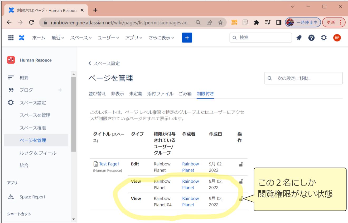 Confluenceでは、View権限が1つでもあると「その人にのみ見せる」という制限になります(逆に1つもなければ全体公開になります)。