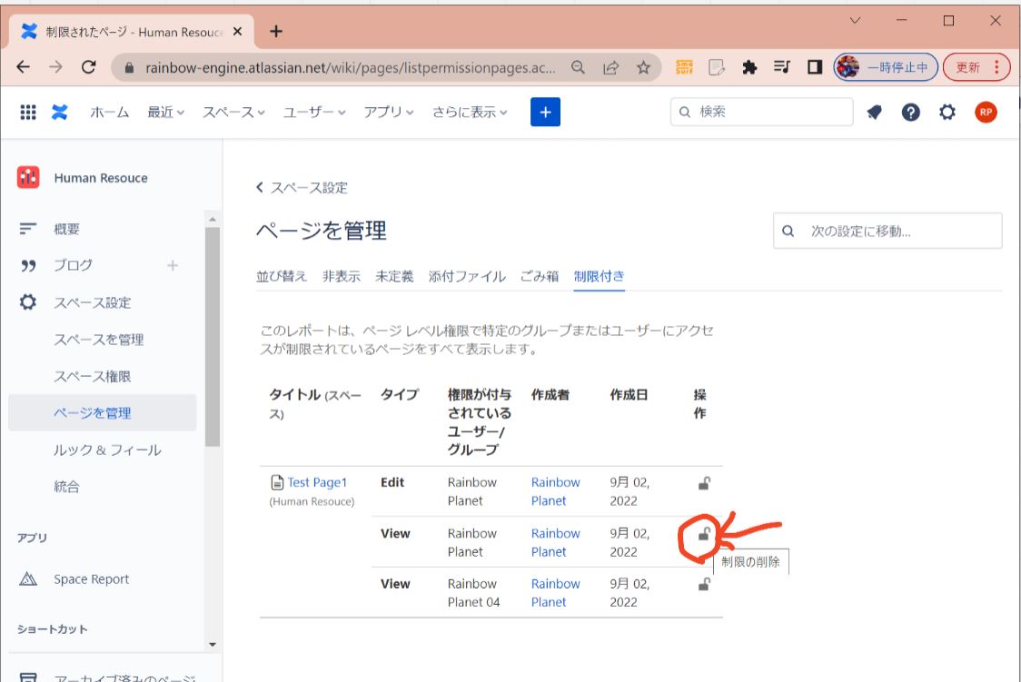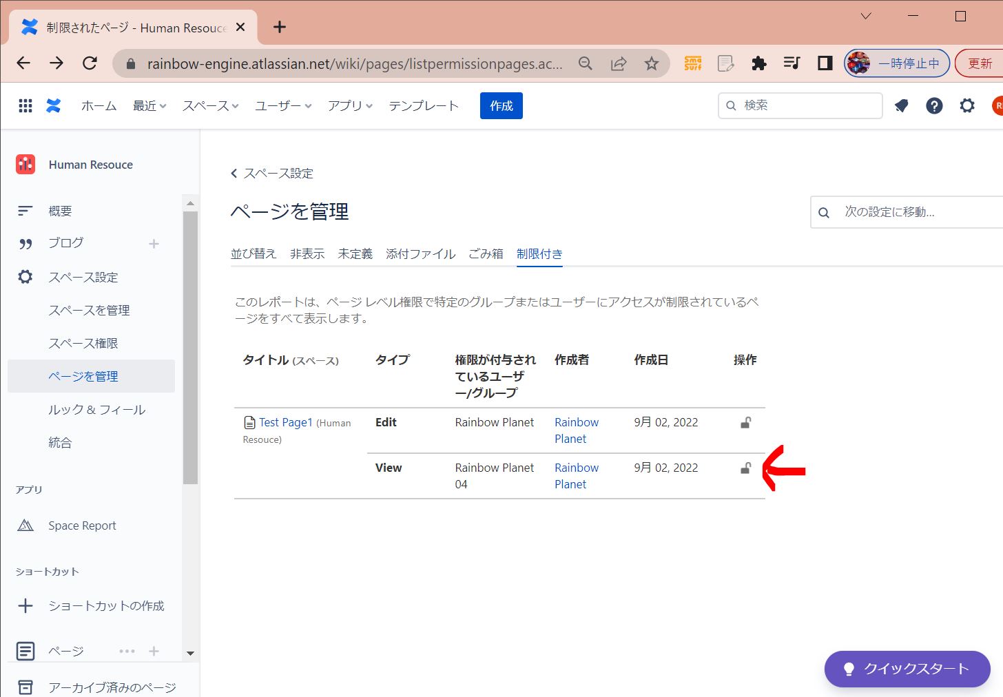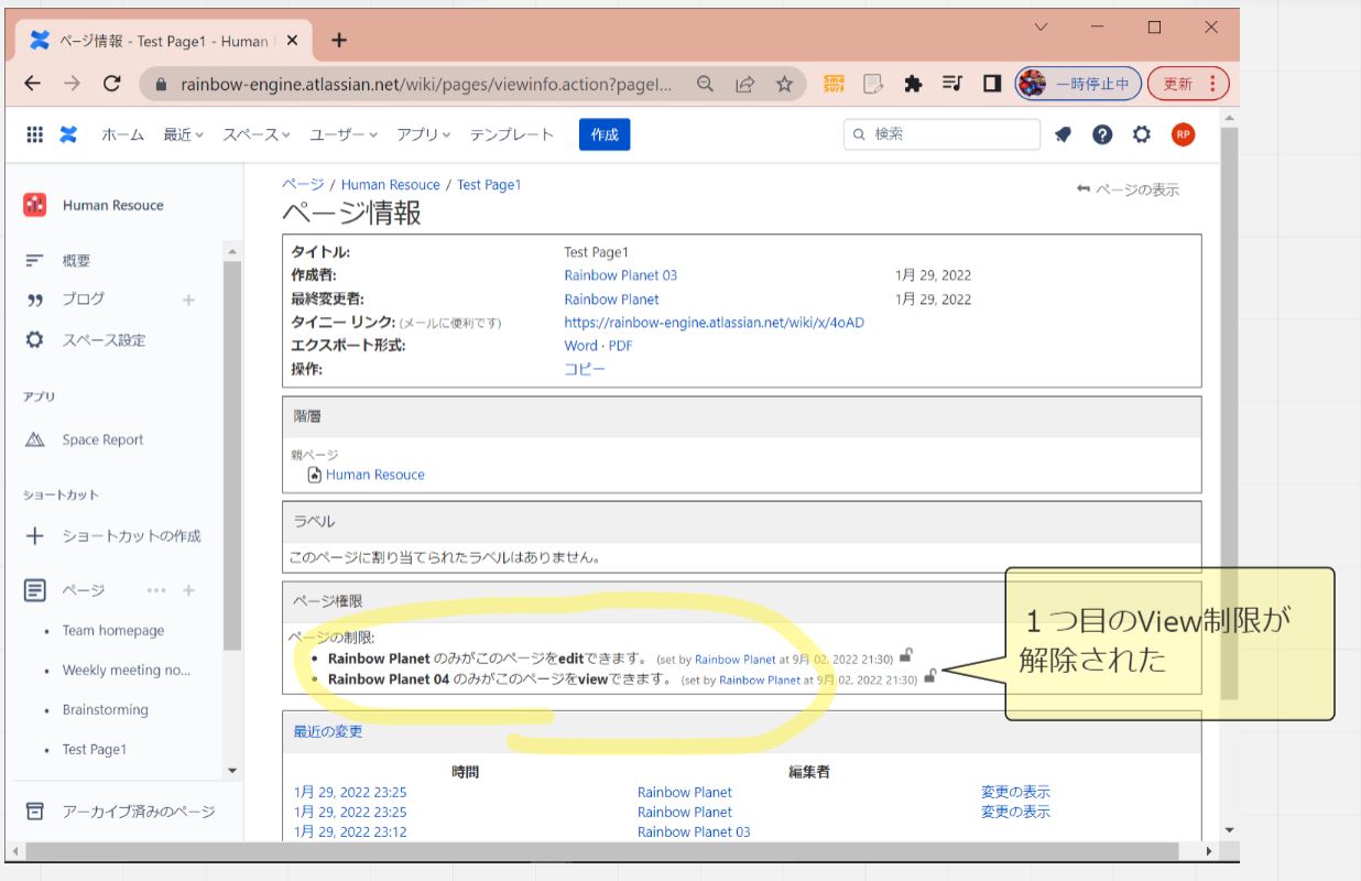 ・④ロック解除後のページ情報が表示されます。View権限が1つ削除され、残り1つになりました。