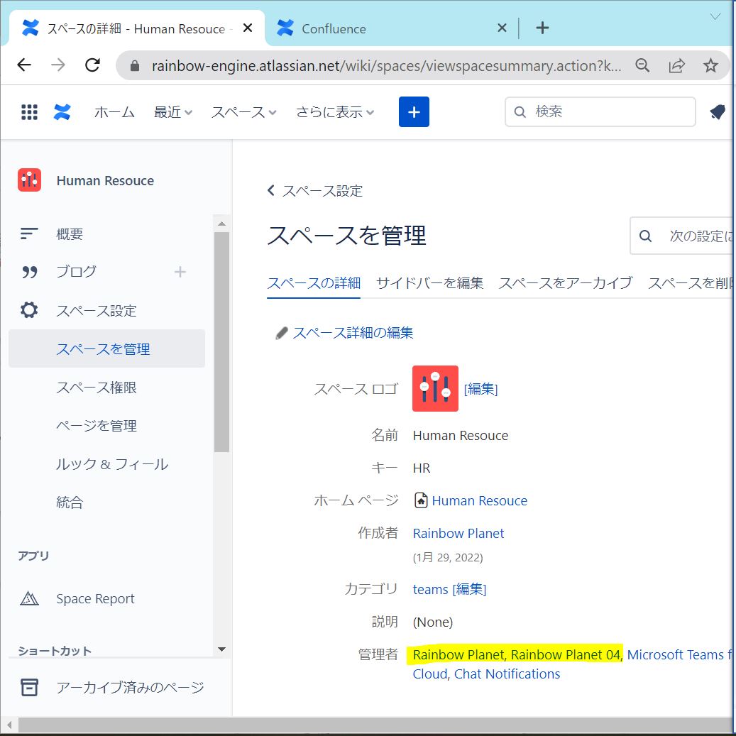 ・⑦スペースの管理者にも、追加した「Rainbow Planet 04」が反映されている