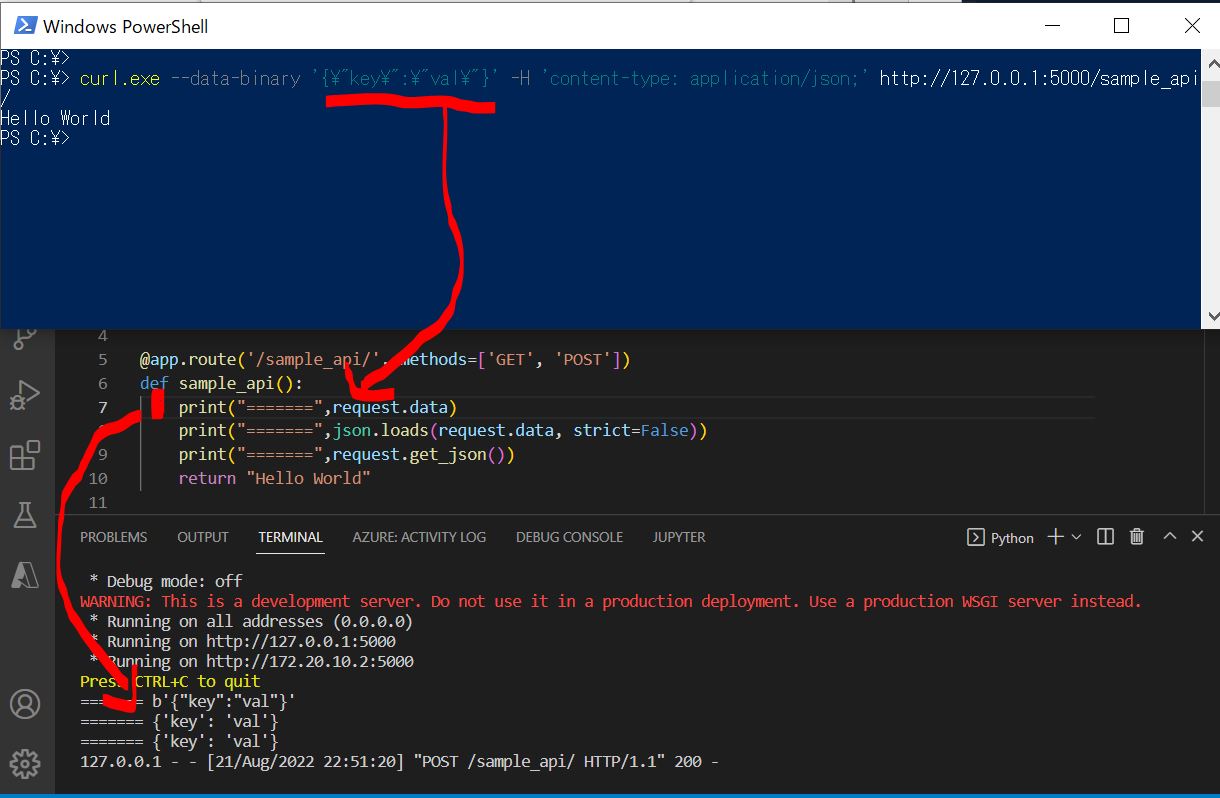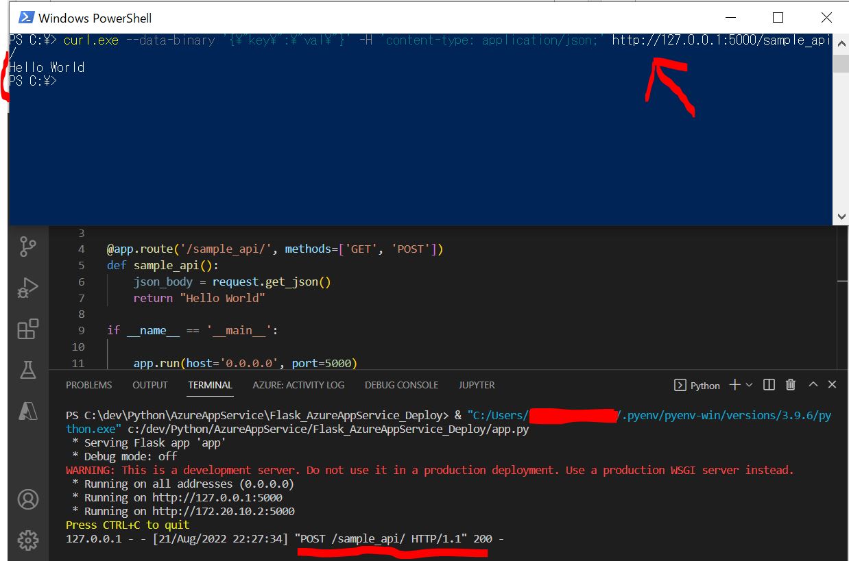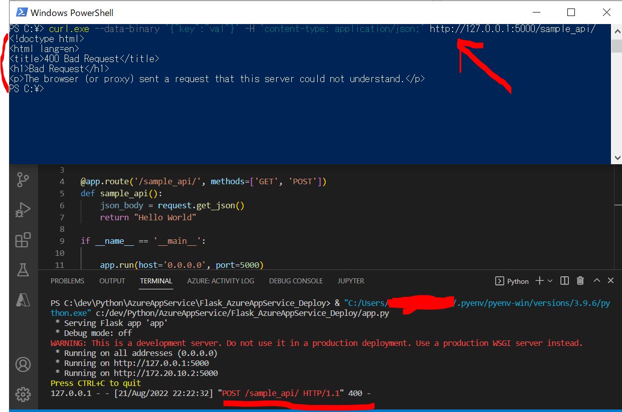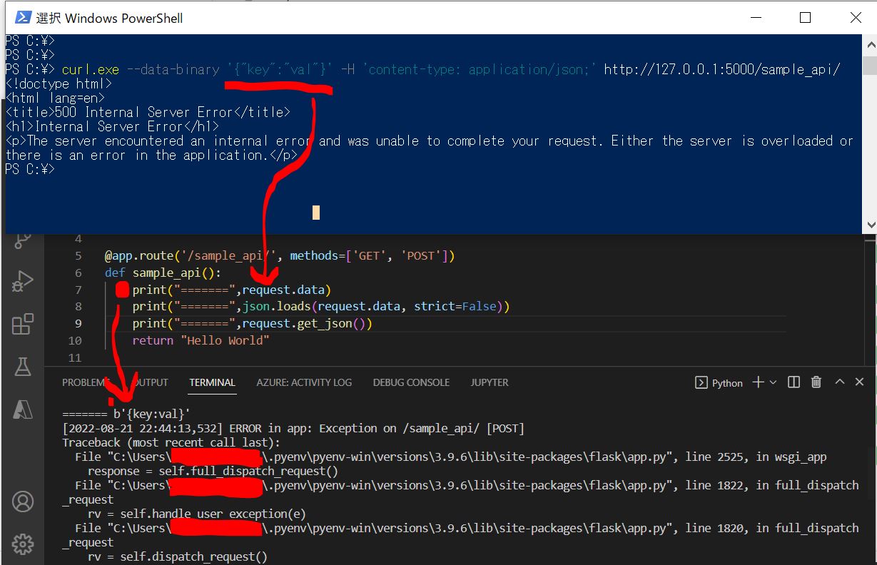 Flaskアプリをローカル実行した状態(http://127.0.0.1:5000)で、設定したエンドポイント(/sample_api/)に対して、PowerShell経由でcurlコマンドからHTTPリクエストを送った際に、下記のエラーが発生しました。