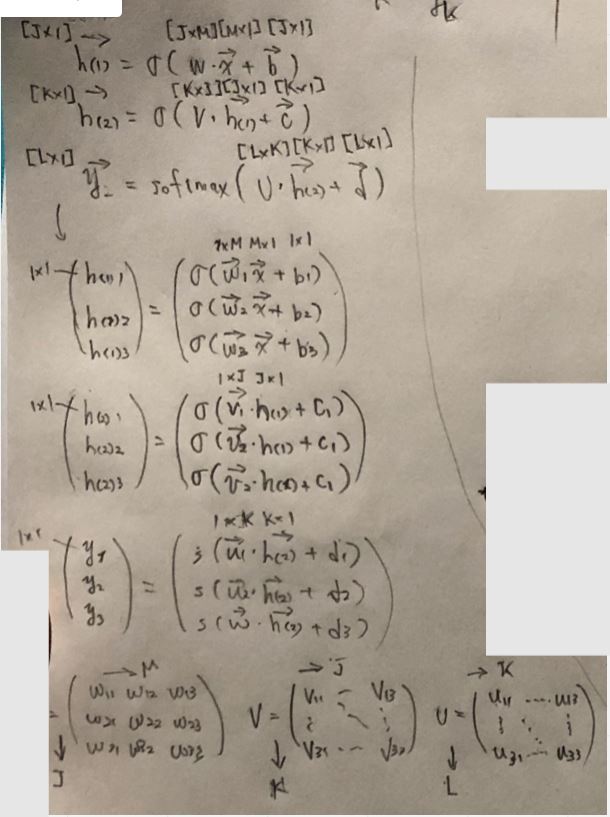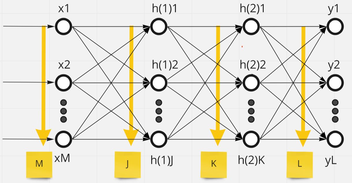 ニューロンは、入力を「M個」、隠れ層1を「J個」、隠れ層2を「K個」、出力を「L個」とします。