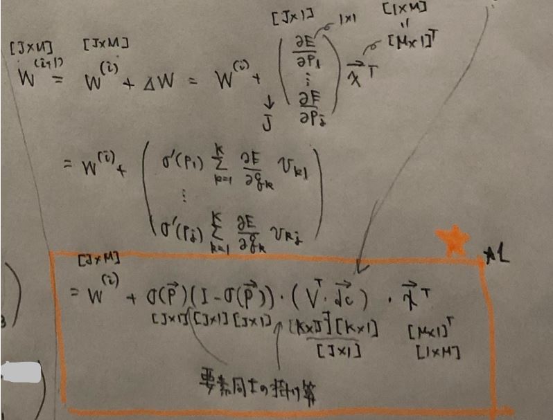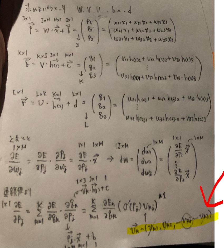 よって\( \frac{\partial E}{\partial p_{j}} = \sum^{K}_{k=1} \frac{\partial E}{\partial q_{k}} \frac{\partial q_{k}}{\partial p_{j}} = \sum^{K}_{k=1} \frac{\partial E}{\partial q_{k}} v_{kj} f^{\prime}(p_{j}) = f^{\prime}(p_{j}) \sum^{K}_{k=1} \frac{\partial E}{\partial q_{k}} v_{kj} \)であるため、元の式に代入すると