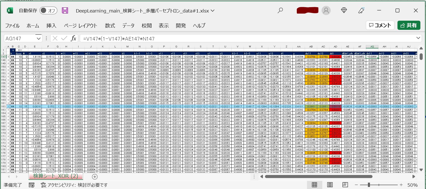 ⇒実物Excelファイル:DeepLearning_main_検算シート_多層パーセプトロン_data#1