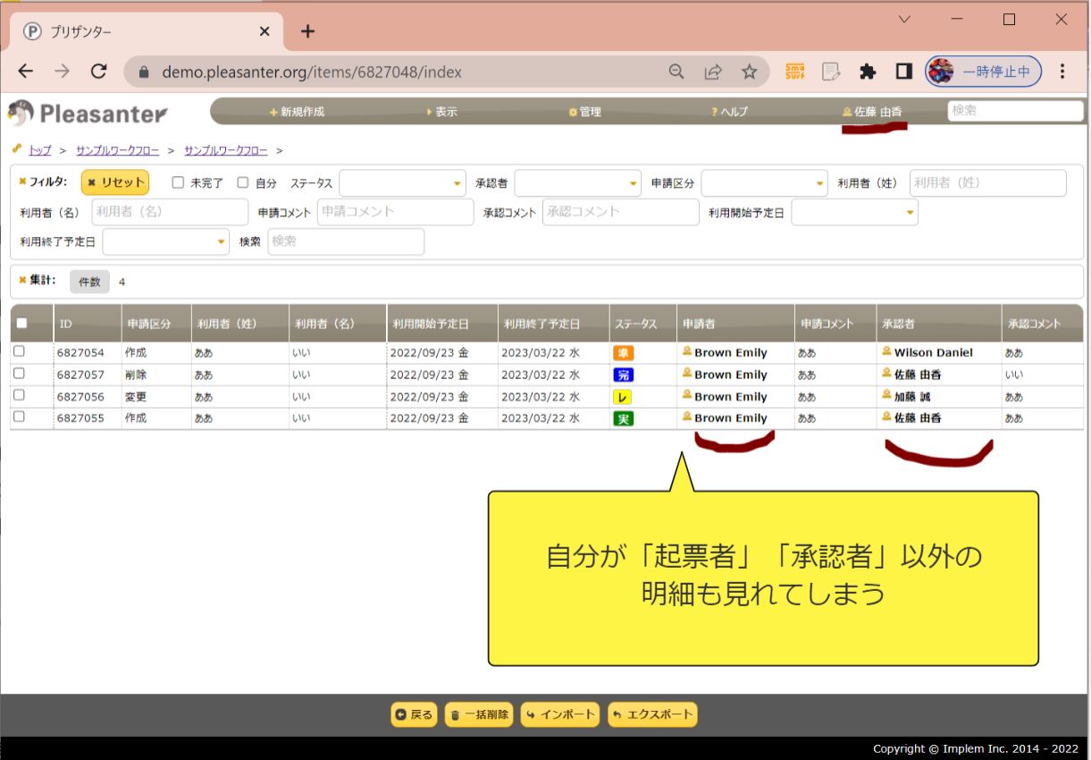 ・プリザンターでワークフローを作る際、自分が「起票者」「承認者」以外の明細も参照できてしまう
