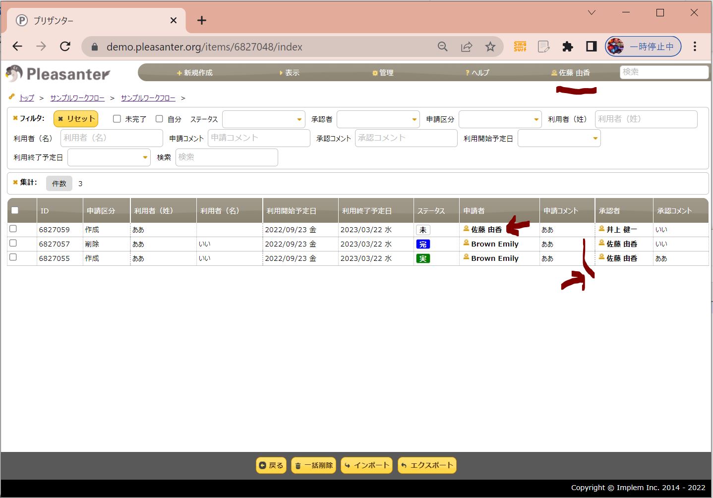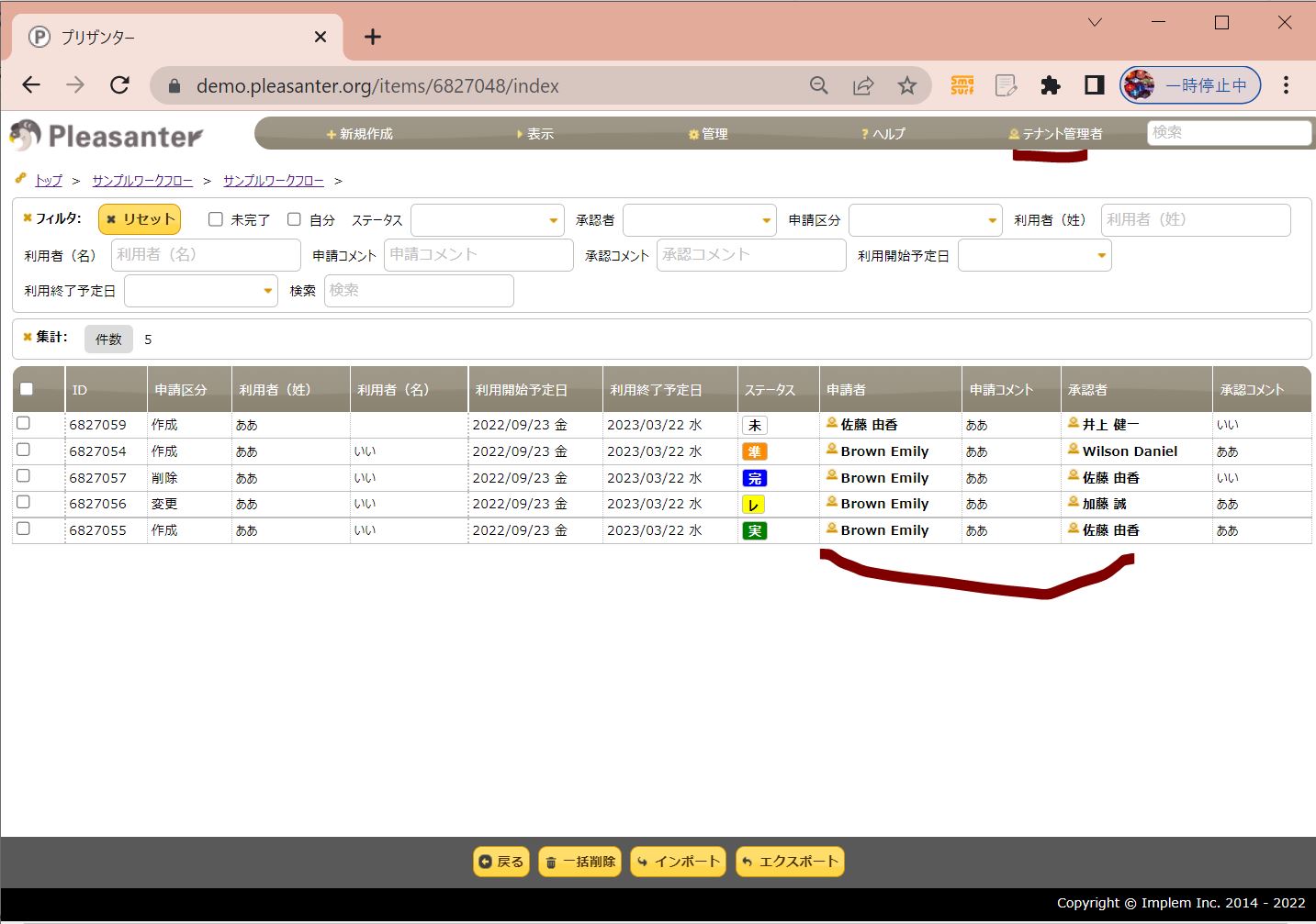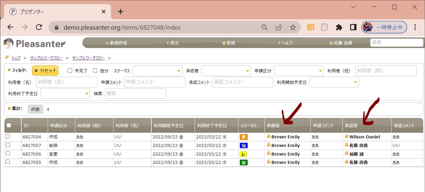 ・再度一覧を確認すると、自身が申請者or承認者のもののみが表示されるようになりました。