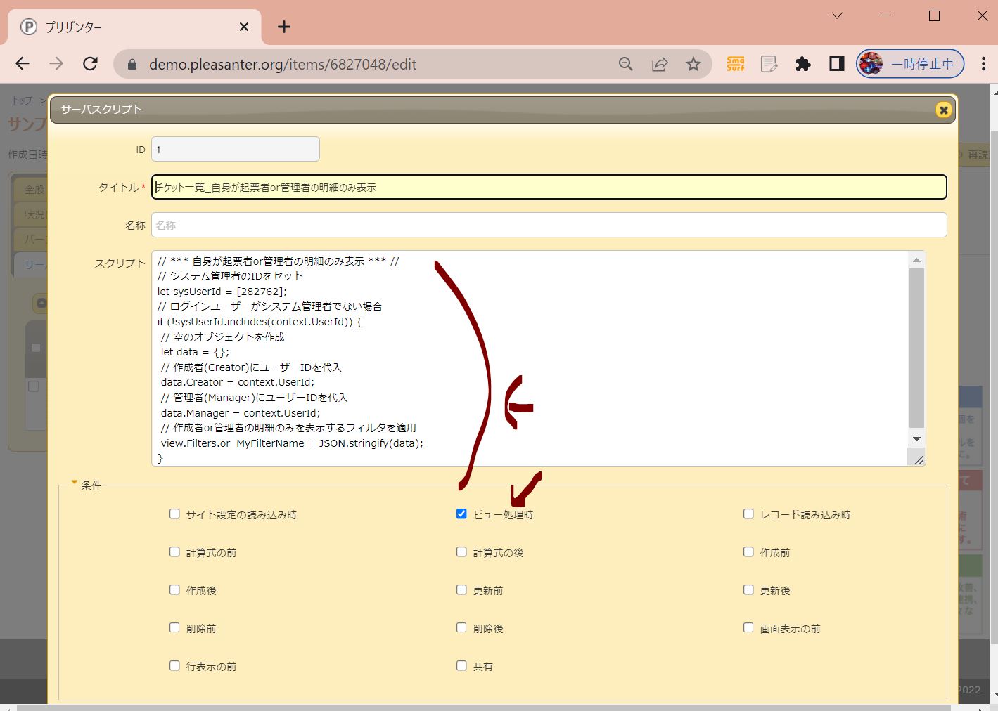 - サーバスクリプトはその名の通り、サーバ側で動くJavaScriptです。JavaScriptというと、クライアント側(ブラウザ)で動作するイメージがありますが、Pleasanterではサーバサイドの様々なイベント時(例:ビュー処理時など)における処理もJavaScriptで記述する事ができます。