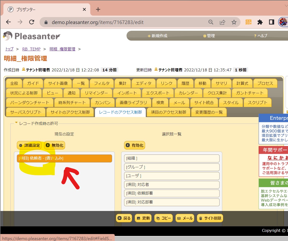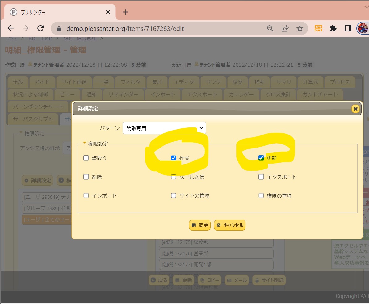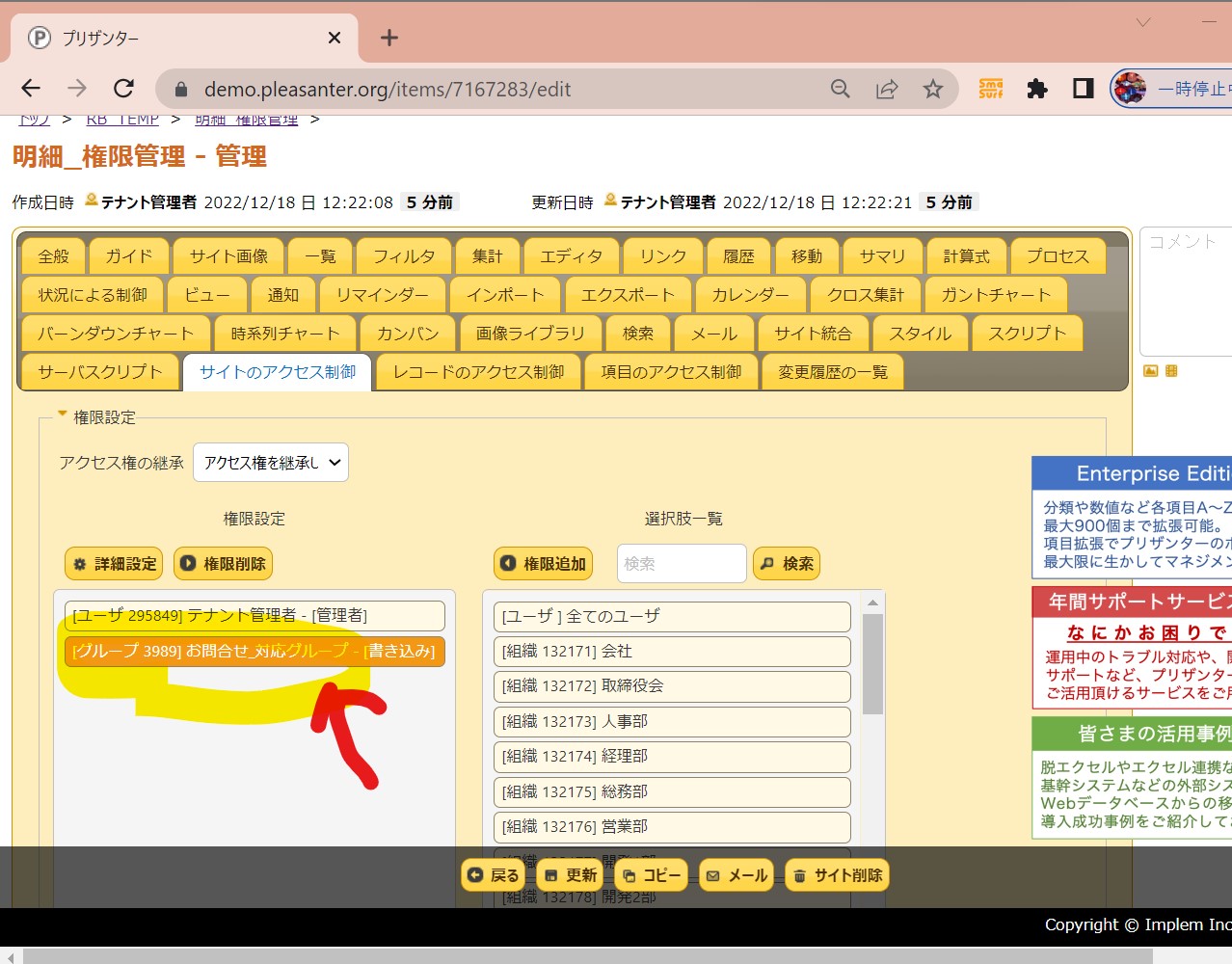 ●③「サイトのアクセス制御」で作成したグループに権限付与