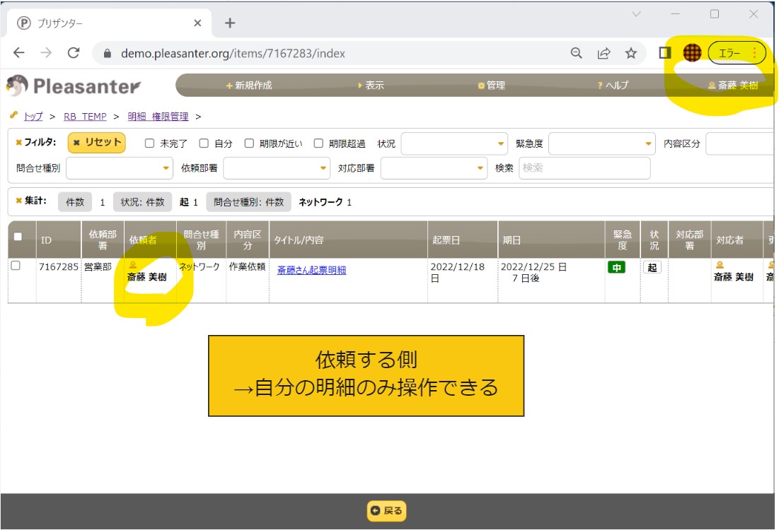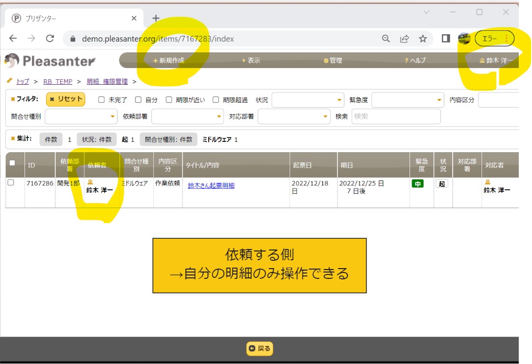 ・【依頼する側】:全ユーザーに起票&更新できる事のチェック