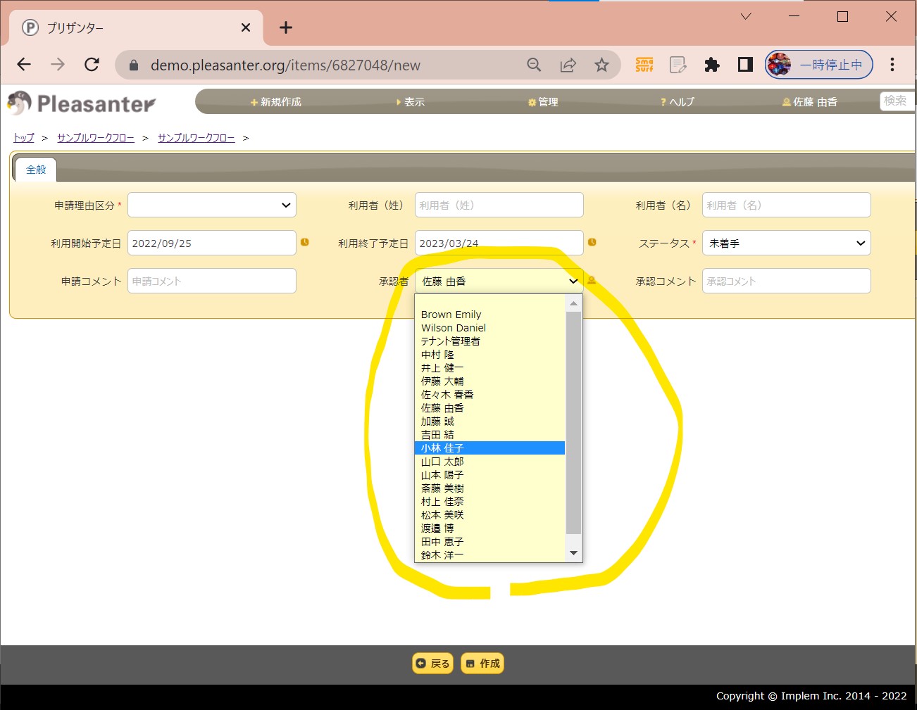 ・プリザンターでワークフローを作る際、「承認者」のプルダウンで本来選べない人も選択できてしまう