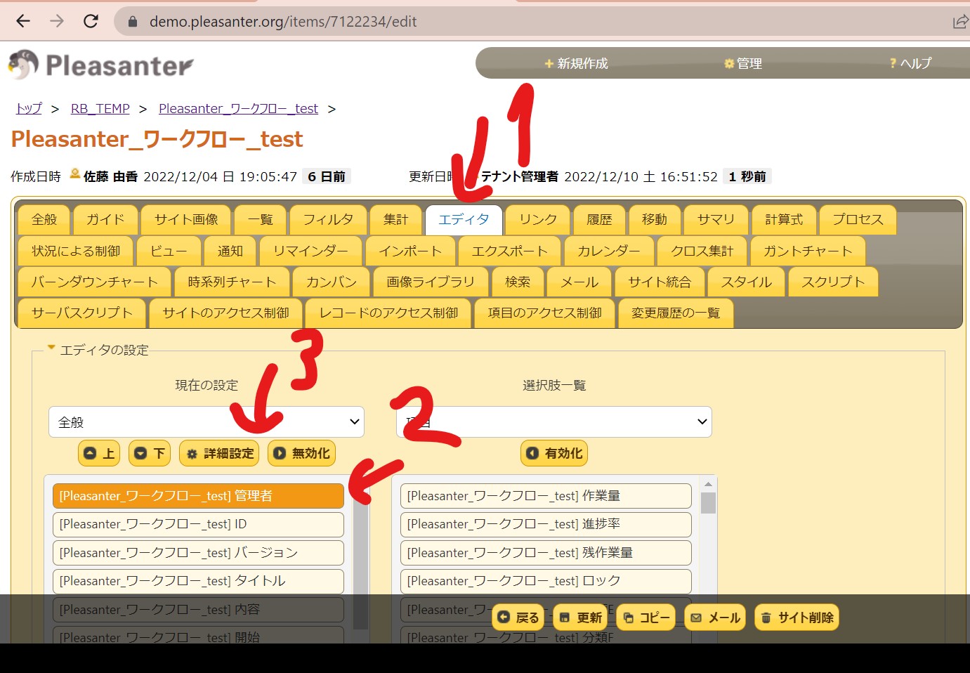 ・①「エディタ」タブ⇒項目を選択⇒「詳細設定」押下