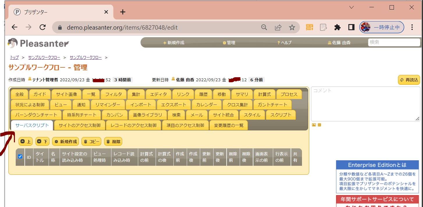 ・「テーブルの管理」→「サーバスクリプト」を選択