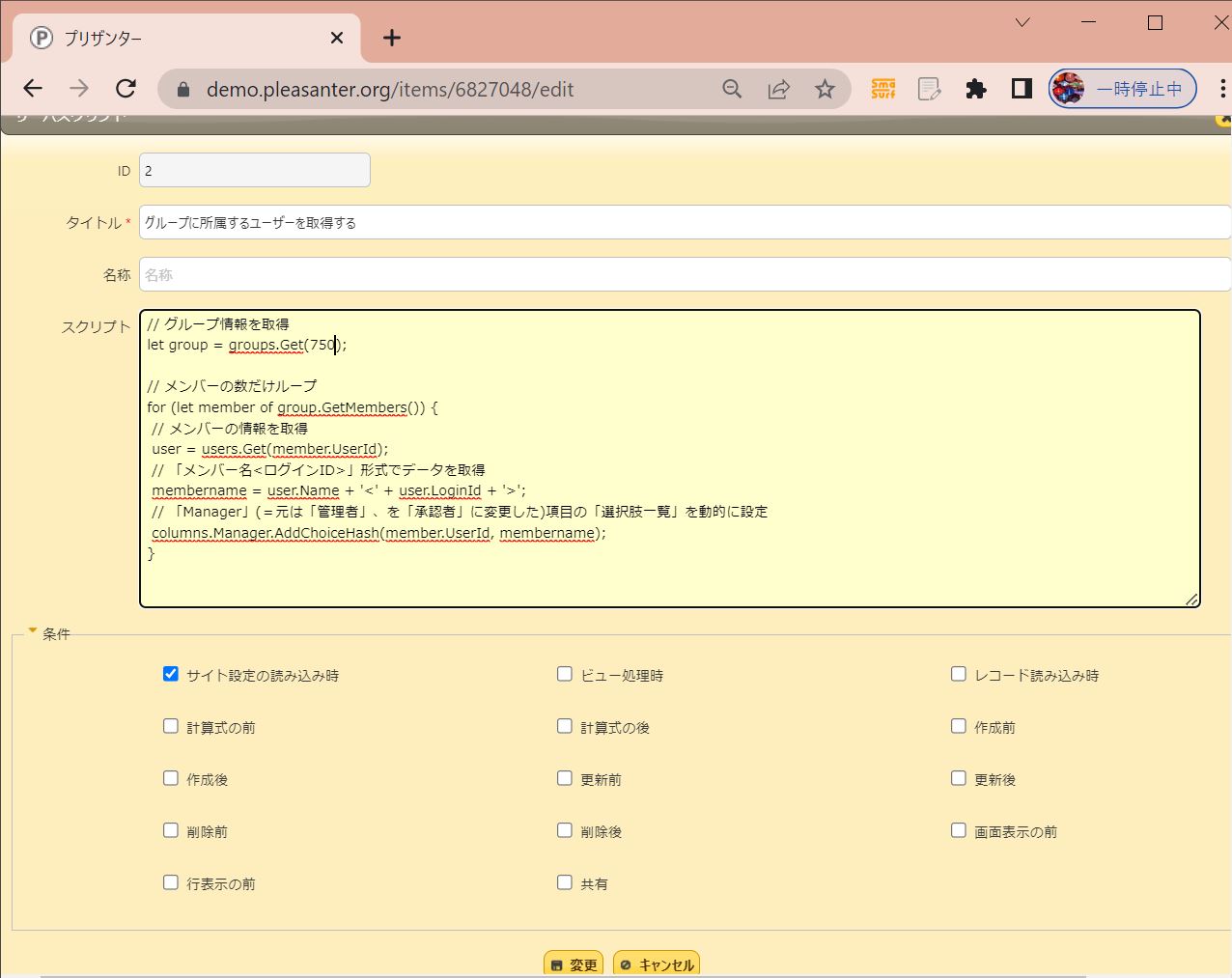 ・下記のサンプルプログラムを適用し、「条件」は「サイト設定の読み込み時」を選択し、「変更」を押下