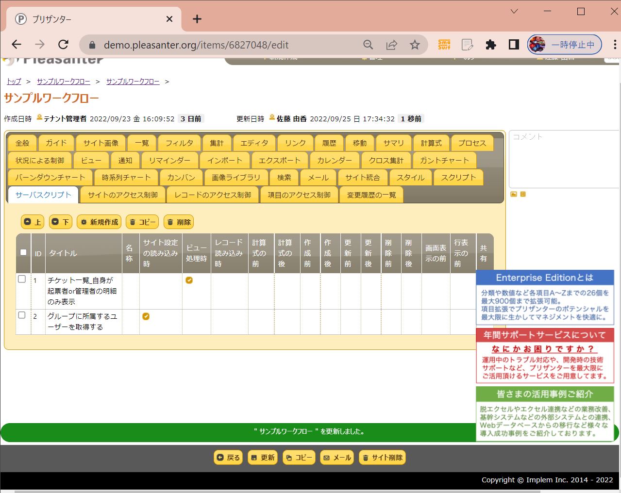 ・サーバスクリプトはその名の通り、サーバ側で動くJavaScriptです。JavaScriptというと、クライアント側(ブラウザ)で動作するイメージがありますが、Pleasanterではサーバサイドの様々なイベント時(例:ビュー処理時など)における処理もJavaScriptで処理を記述する事ができます。