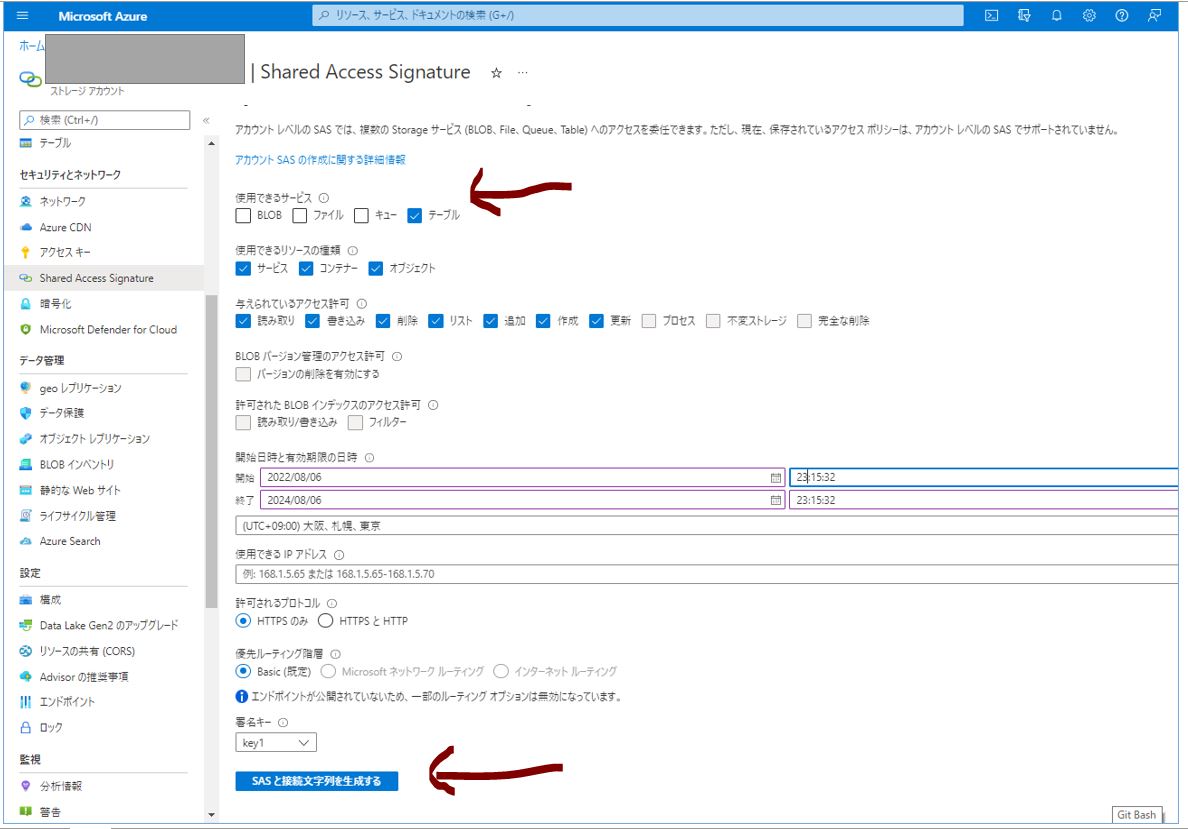 ③「テーブル」にチェックが入っている事を確認し、他に必要な条件を入力して「SASと接続文字列を生成する」を押下
