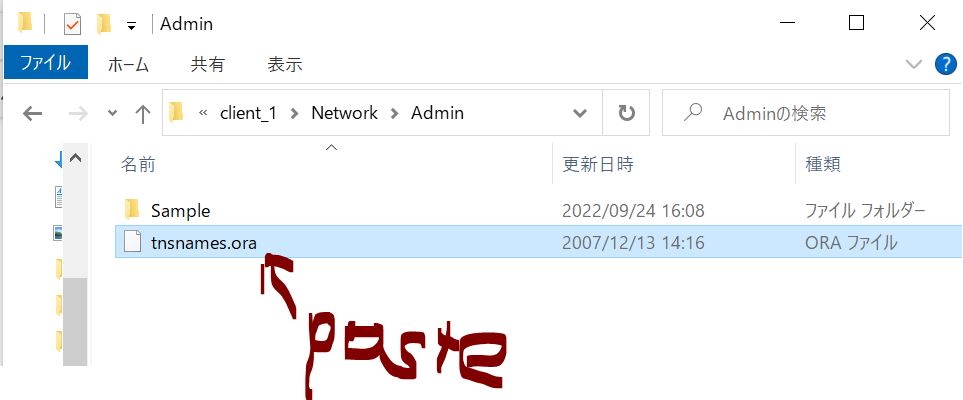 ・① tnsnames.ora ファイルのサンプルを以下ディレクトリから取得し、(Admin 配下に無い場合)1つ上の Admin 配下にコピーします。