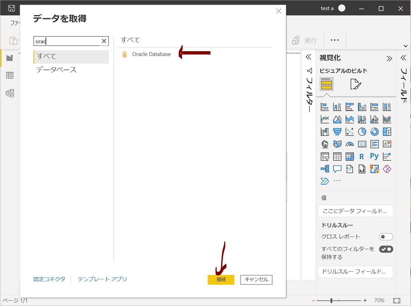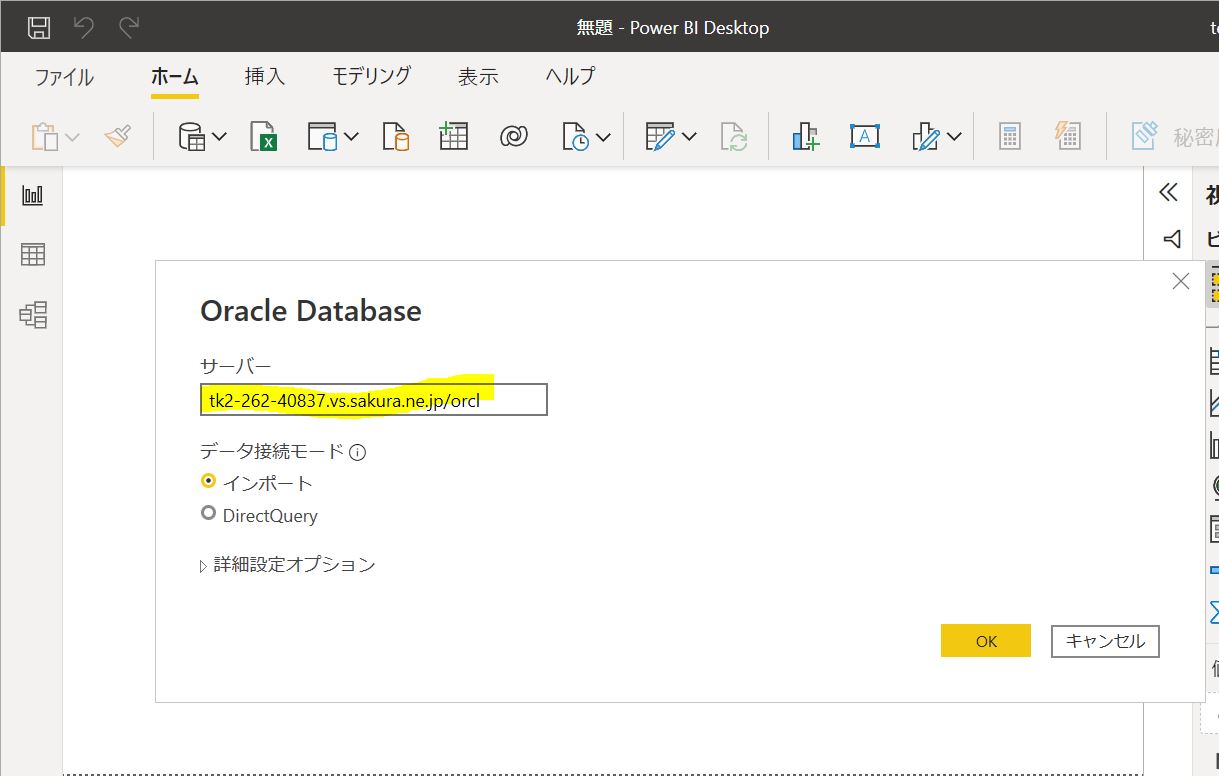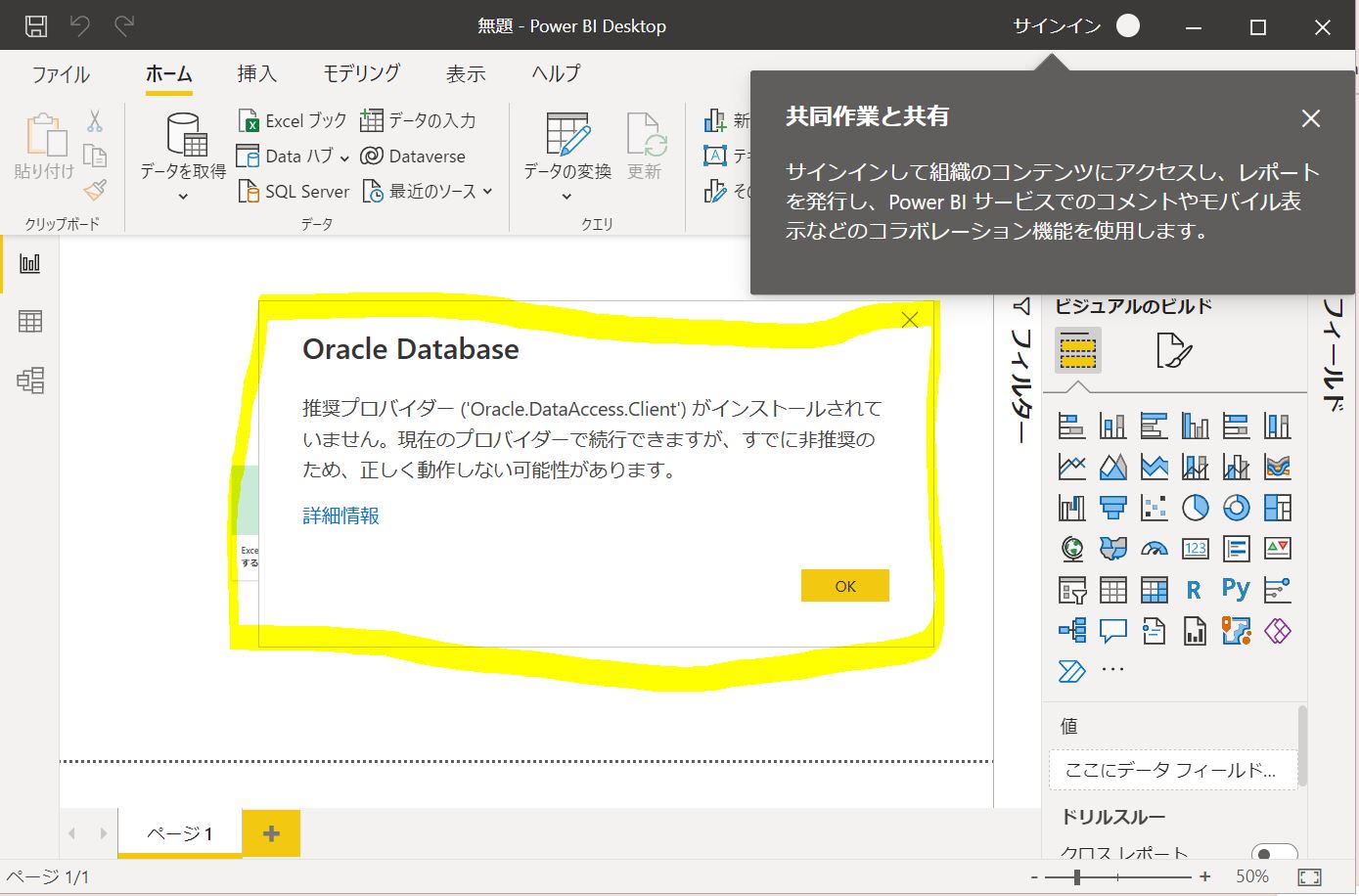 Power BI Desktopで「ホーム」→「データを取得」の画面から「Oracle Database」を選択して「接続」を押下したらエラーが出ました。