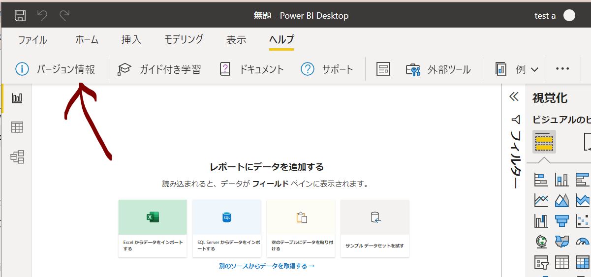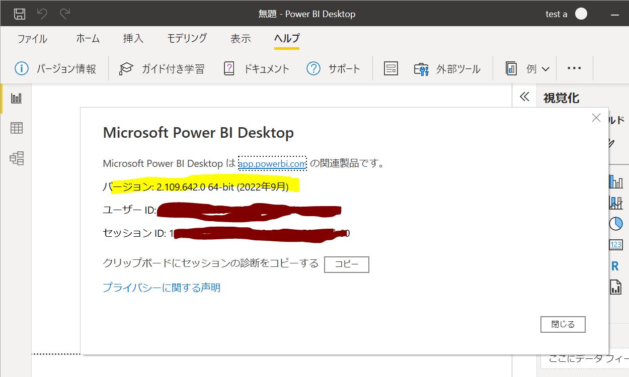 Power BI Desktopが32bitか64bitかによって、インストールするソフトが変わるため、まずはご自身のバージョンを確認します(2022年)