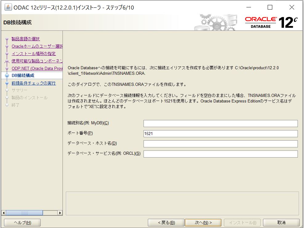 ・「DBサーバ名/データソース名(tnsnames.oraの左辺)」を入力します。