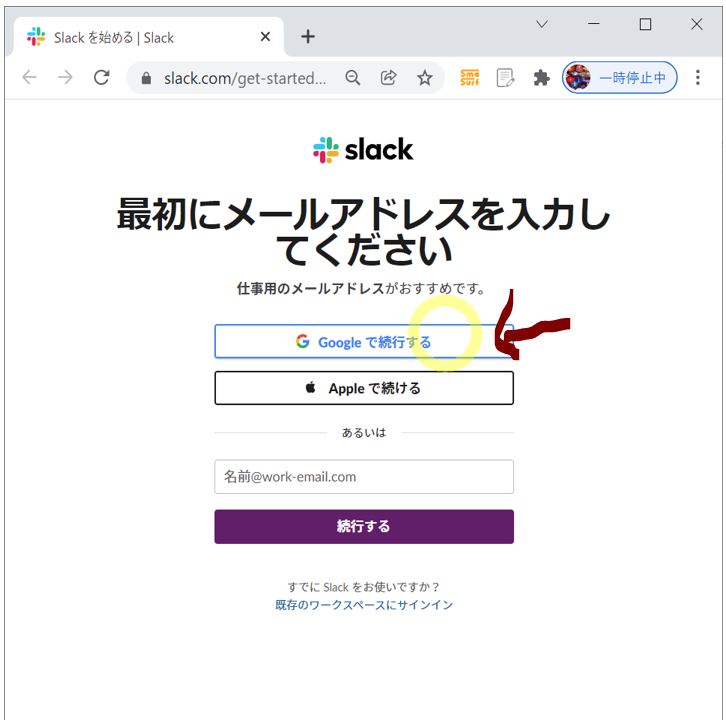 ・①メールアドレスの設定(今回は「Googleで続行」を押下)