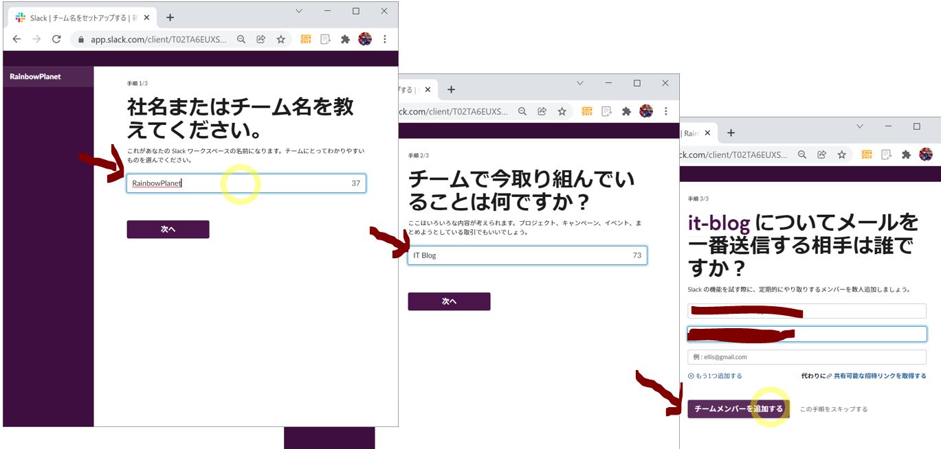 左は「ワークスペース名」の設定、中央は最初に作成するチャンネル名、右はワークスペースに最初に招待するユーザーです。