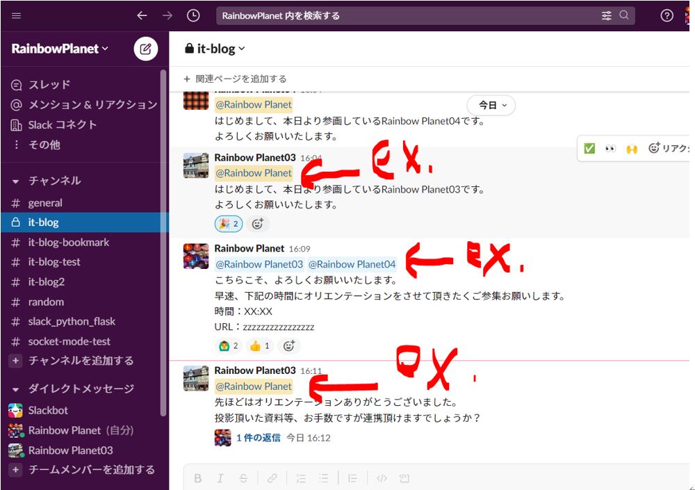 ・「@[相手の表示名]」でメンションする事で、相手に気づいて貰い易くなります。