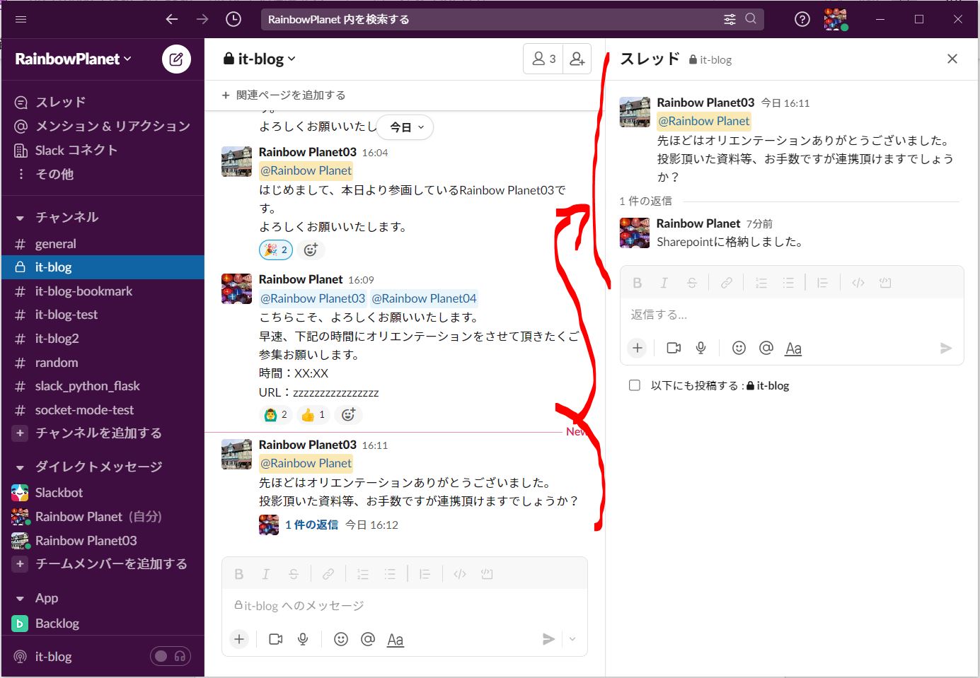 ・チャンネル内でも、投稿に対して「返信」する形で返す事により、同一の話題は纏まって1つのスレッドとなるため、視認性が飛躍的に高まります(同一の話題毎にスレッドが分かれていくため)。