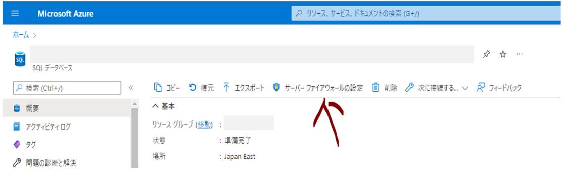 ・① Azure上でSQL Serverの「サーバー ファイアウォール設定」を押下