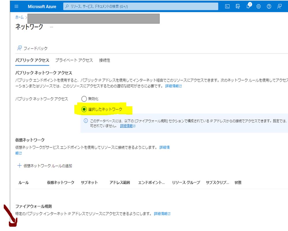 ・②「パブリックアクセス」→「パブリックネットワークアクセス」が「選択したネットワーク」になっていることを確認し、「ファイアウォール規則」へ進みます。