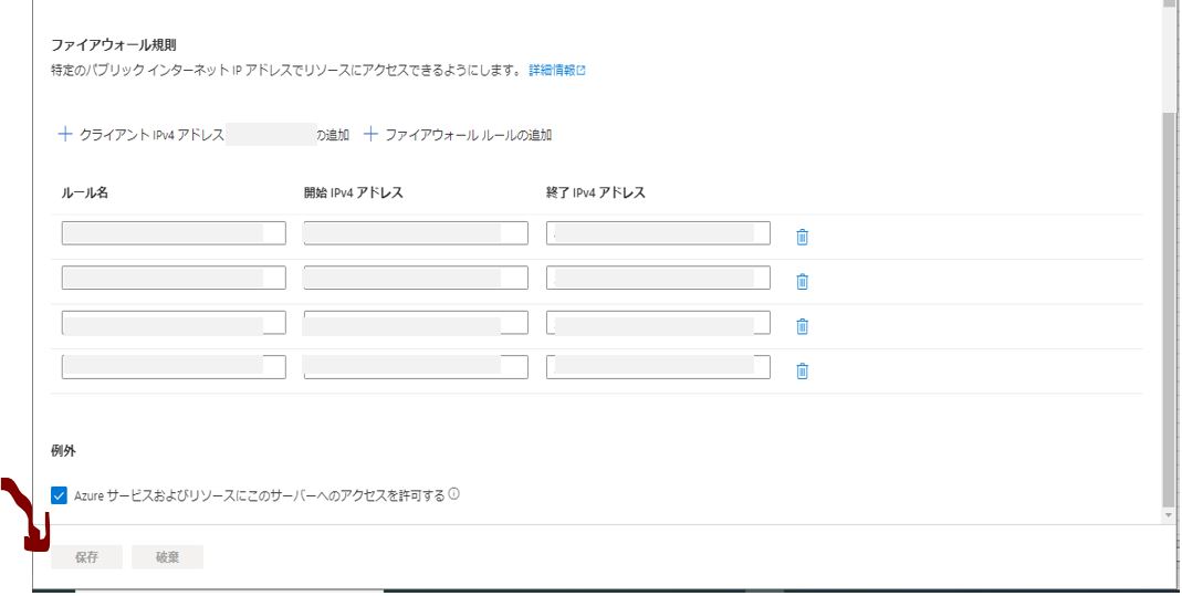 ・③「ファイアウォール規則」にご自身のIPアドレスを追加します。