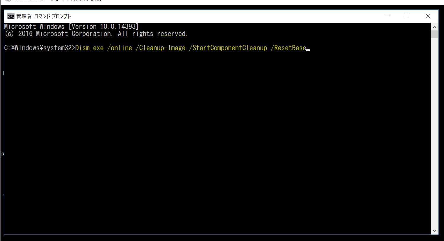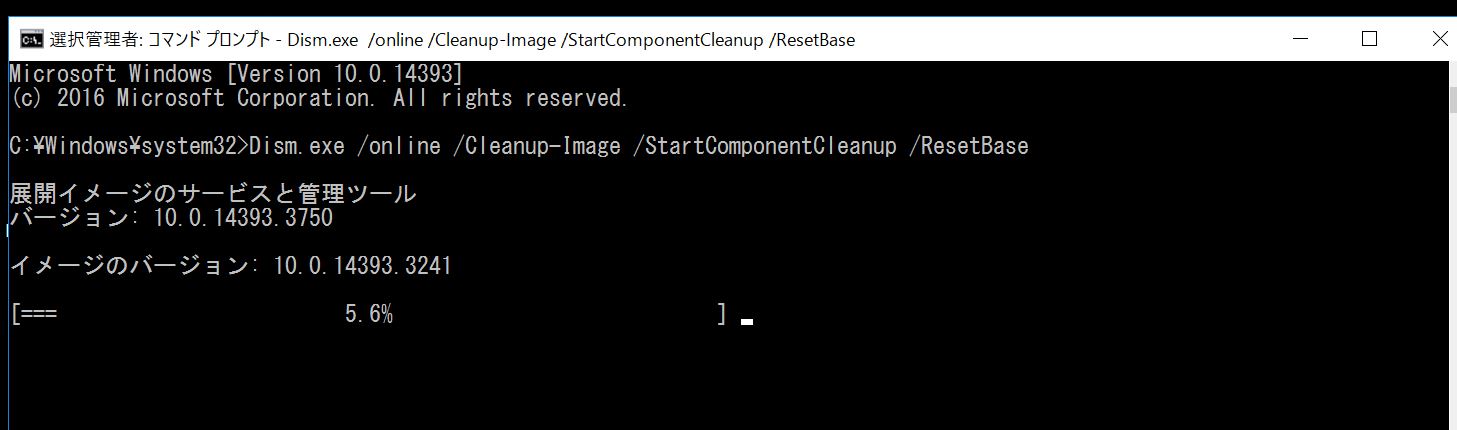 C:\Windows\system32>Dism.exe /online /Cleanup-Image /StartComponentCleanup /ResetBase 展開イメージのサービスと管理ツール バージョン: 10.0.14393.3750 イメージのバージョン: 10.0.14393.3241 [=== 5.6% ]