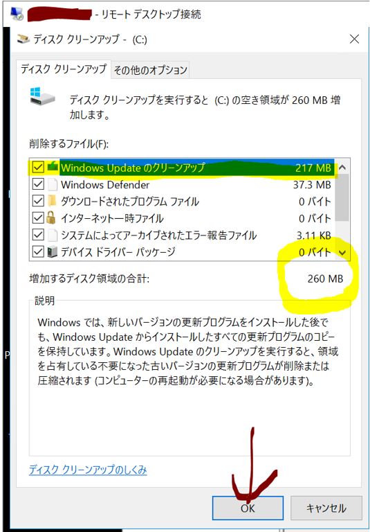 ・④Windows Update実施後、「Windows Updateのクリーンアップ」が表示されるので選択して「OK」押下