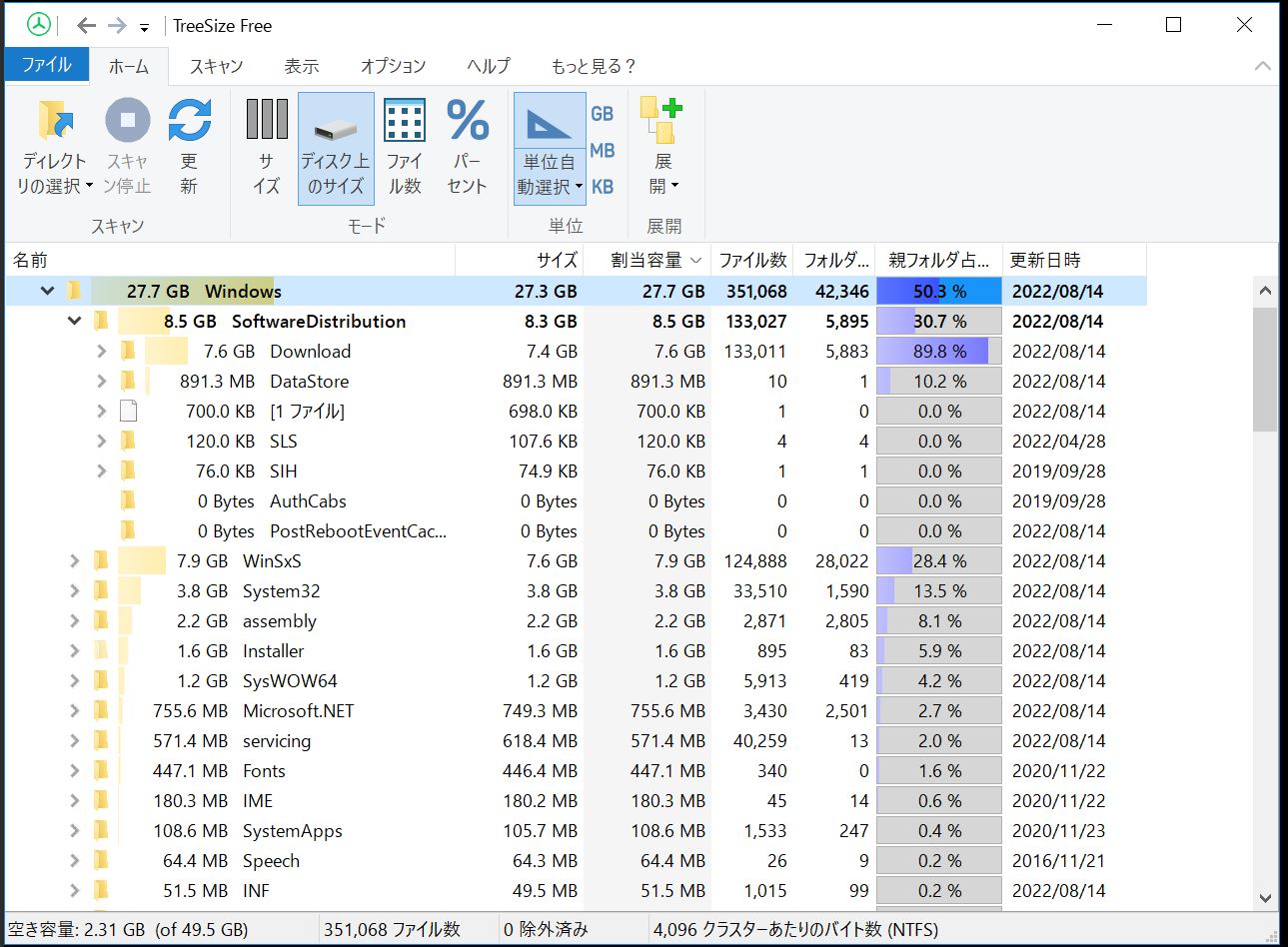 「C:\Windows\WinSxS」が容量を圧迫していた。